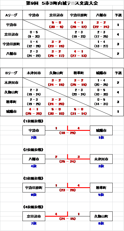7月19日(日)に行われた5市3町山城テニス交流大会で、宇治市は2位でした。 | ||||||||||||||||||||||||||||||||||||||||||||||||